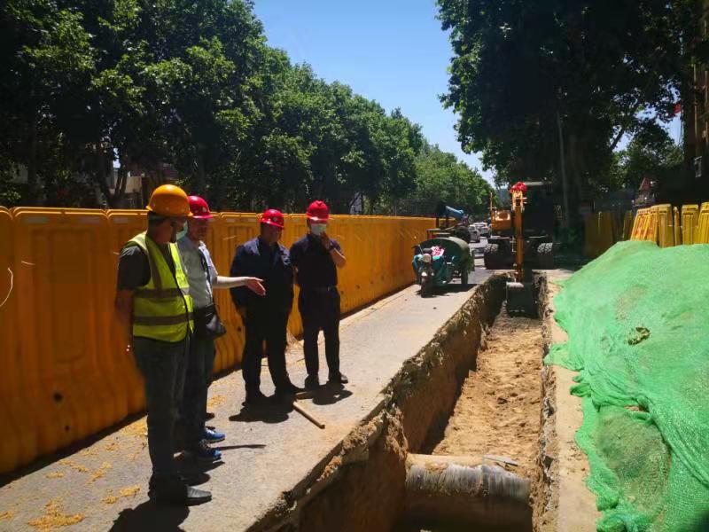 施工前期,為了保障沿途各交叉管線的線路安全,采取了全線高水馬圍擋全封閉式施工,邀請(qǐng)各交叉管線的產(chǎn)權(quán)單位到施工現(xiàn)場溝通協(xié)調(diào),并遵循安全文明施工與環(huán)境保護(hù)的要求,與各施工隊(duì)伍簽訂“2021年‘冬病夏治’計(jì)劃施工安全保證協(xié)議書”。期間,安排專人對(duì)施工現(xiàn)場的圍擋支護(hù)、溝槽開挖、防揚(yáng)塵措施、工具擺放等方面進(jìn)行全方位、全時(shí)段、全覆蓋的巡查,緊抓問責(zé)不放松。同時(shí),對(duì)施工現(xiàn)場進(jìn)行組織調(diào)度,使各項(xiàng)改造工作有序銜接、穩(wěn)步推進(jìn)。